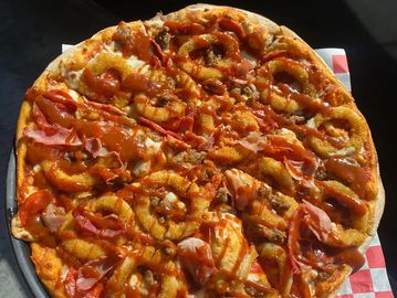Pepperoni, tocino, aros de cebolla, bañada en aderezo bbq de la casa