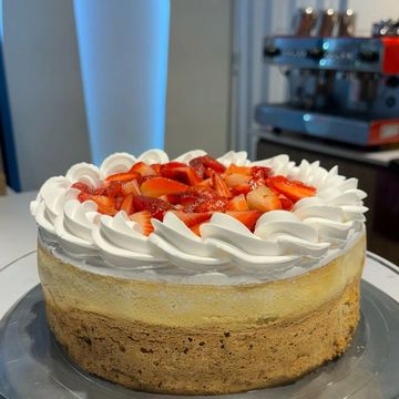 Mostachón con cheesecake estilo New York. Y en su parte superior deliciosas fresas