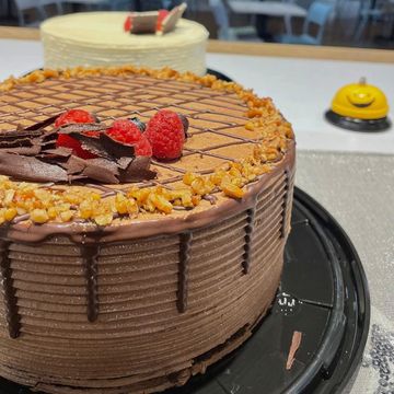 Disfruta de este pastel con rico betun elaborado con cocoa, chocolate amargo, y en la decoración nuez horneada con frutos rojos.