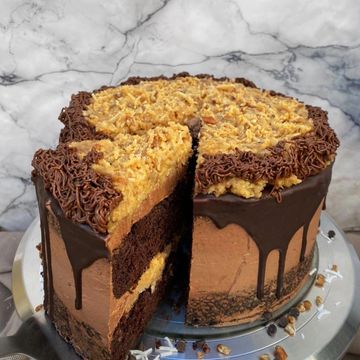 Poderoso bizcocho de doble chocolate mexicano, semi-cubierto de terso y delicado betún. Entre capas encontrarás nuestro auténtico relleno de la receta original, con abundante coco-nuez