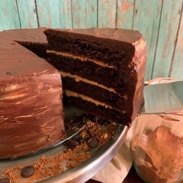 Cuatro deliciosas capas de bizcocho de chocolate con relleno de crema de cacahuate y cubierto con nuestro betún de mantequilla, chocolate y cocoa. ¡Un combinación irresistible!