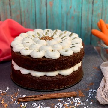 Delicioso bizcocho compuesto de piña almibarada, nuez regional, coco tropical y una gran cantidad de zanahoria finamente rallada. Cubierto de nuestro suave betún de queso crema, con toppig de pepitas.